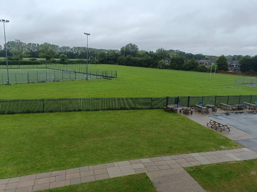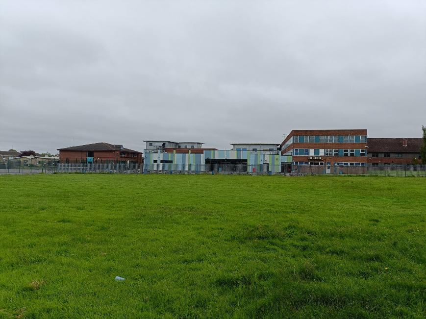 View from playground looking at Artificial pitch. Uppingham Rd running left to right beyond the bushes.