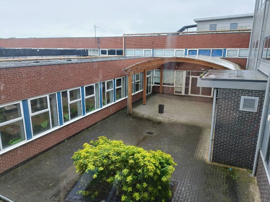 View from main hall doorway, looking towards teaching block. The Cafe is on the right