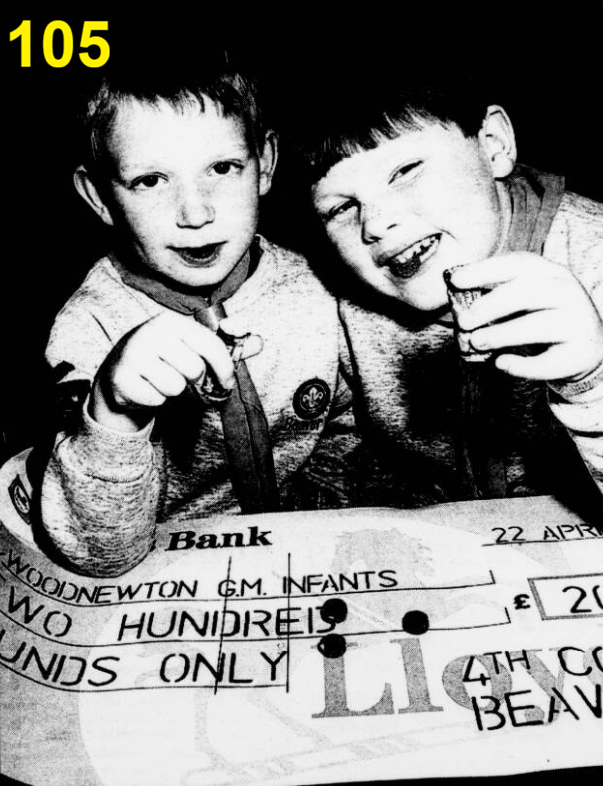 4th Corby Beavers present a cheque to Woodnewton Infants, 1996.